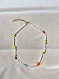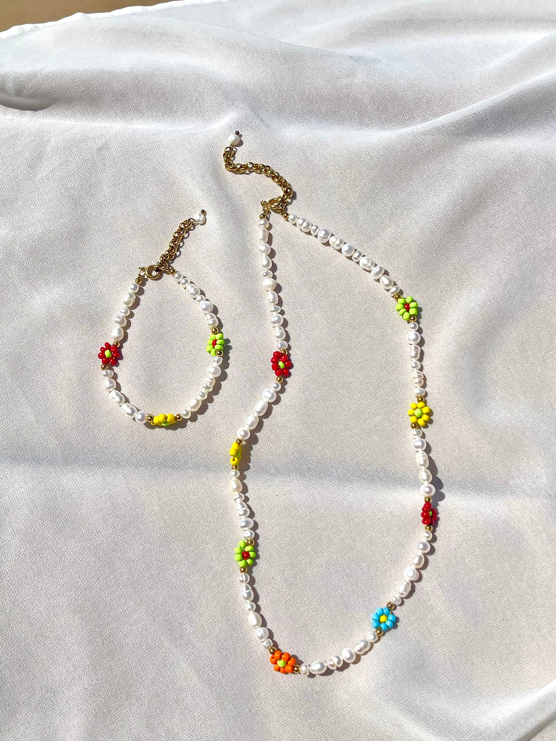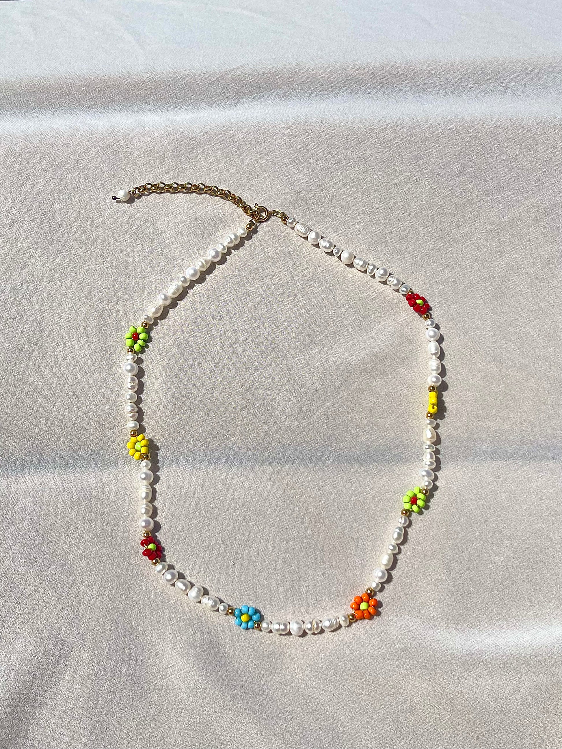 The Flower Power Necklace is made of irregular freshwater pearls and beaded colorful flowers.