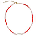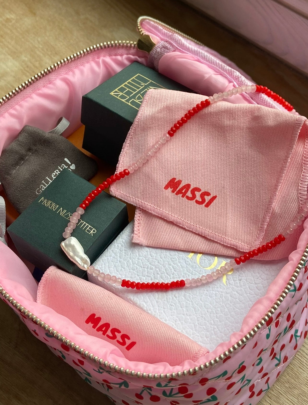 Say hello to our Signature Massi Necklace. This necklace is one of a kind and designed to represent Massi Jewelry with it´s shimmering stones in red and pink colors.