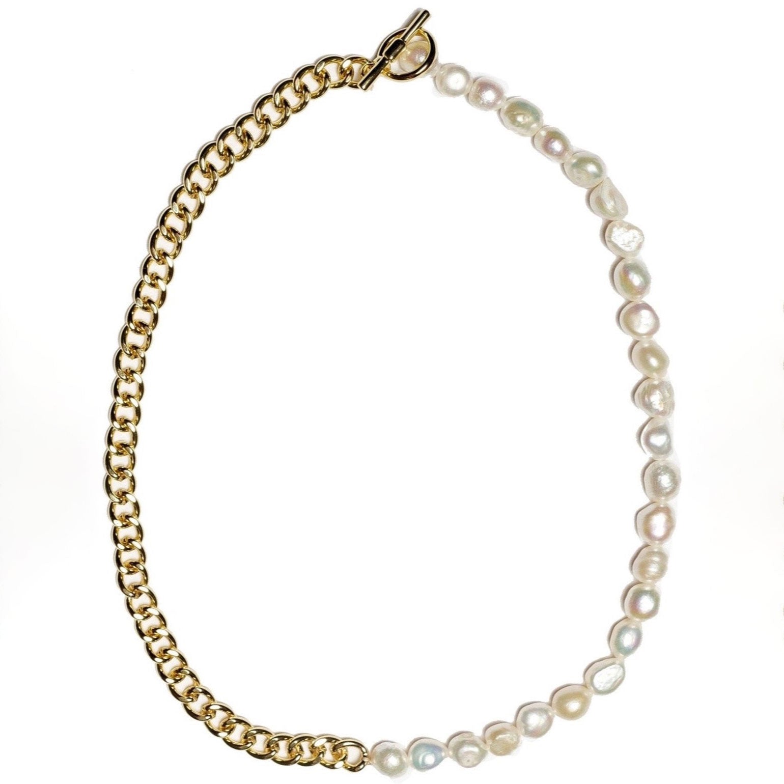 The 50 Necklace is made of 50% fresh water pearls and 50% goltplated stainless steel chunky chain.